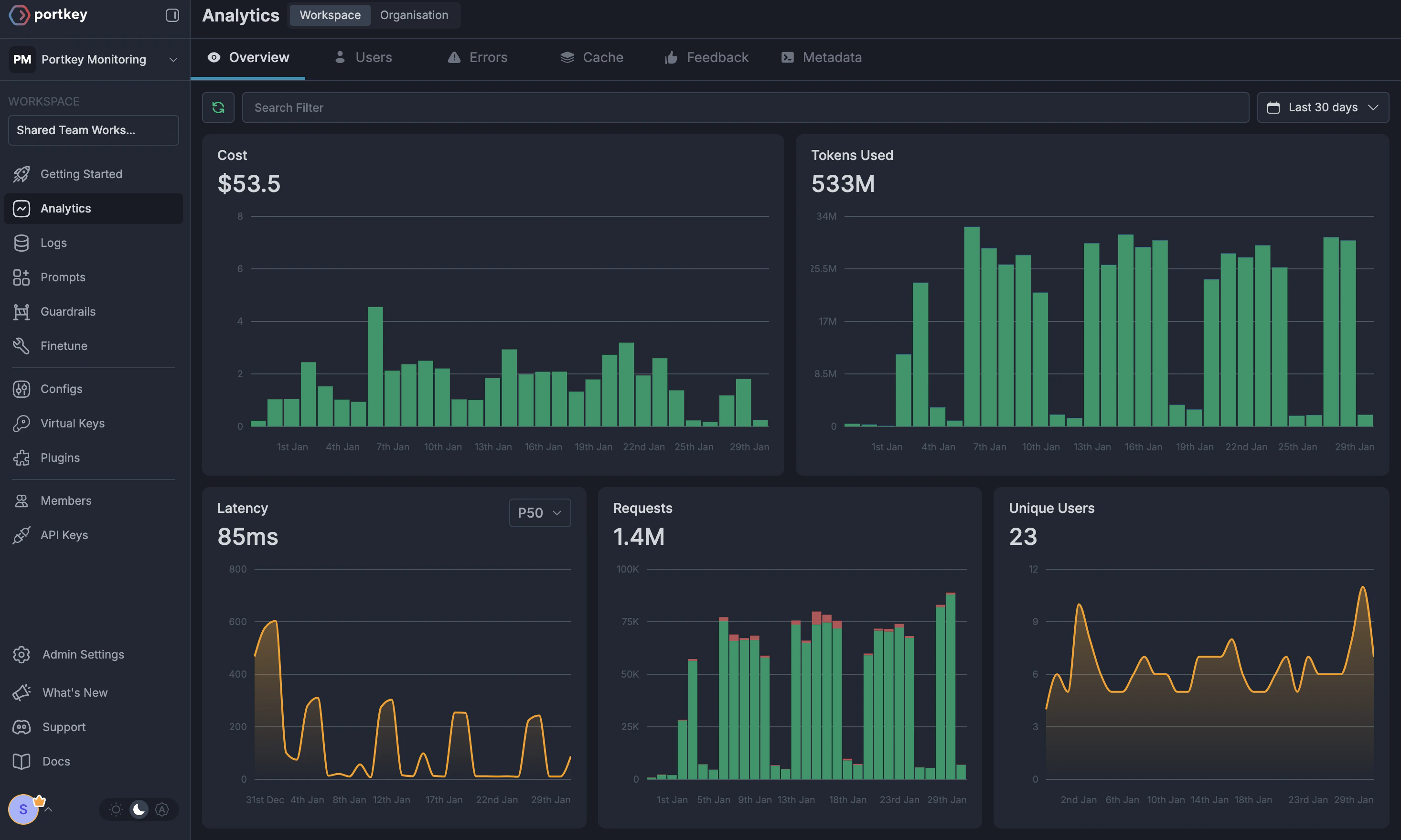 Using Portkey you can track 40+ key metrics including cost, token usage, response time, and performance across all your LLM providers in real time. You can also filter these metrics based on custom metadata that you can set in your configs. Learn more about metadata here.
