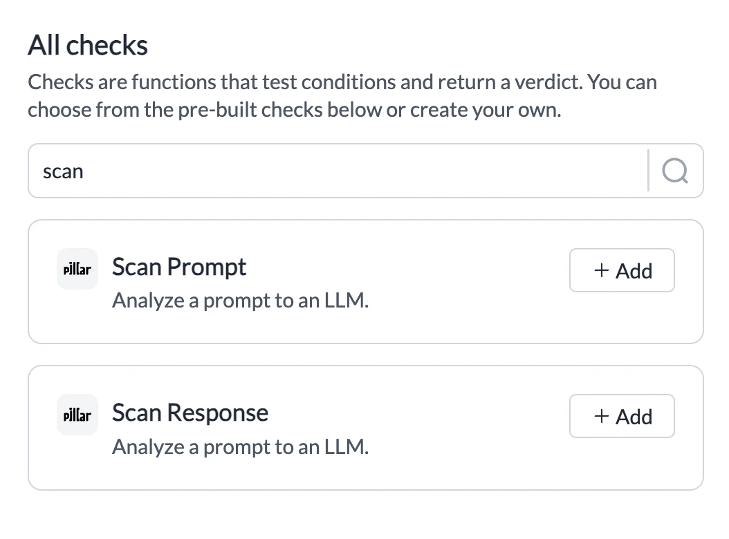 • Search for Pillar’s Guardrail Checks Scan Prompt or Scan Response and click on Add