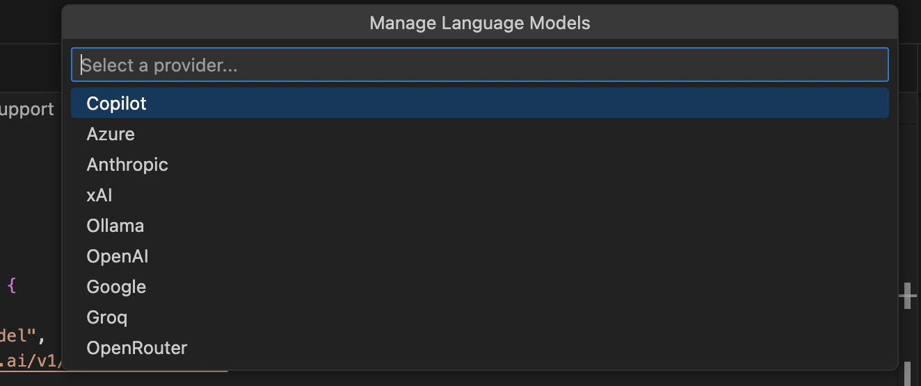 In Copilot chat, click the model dropdown → Manage Models.