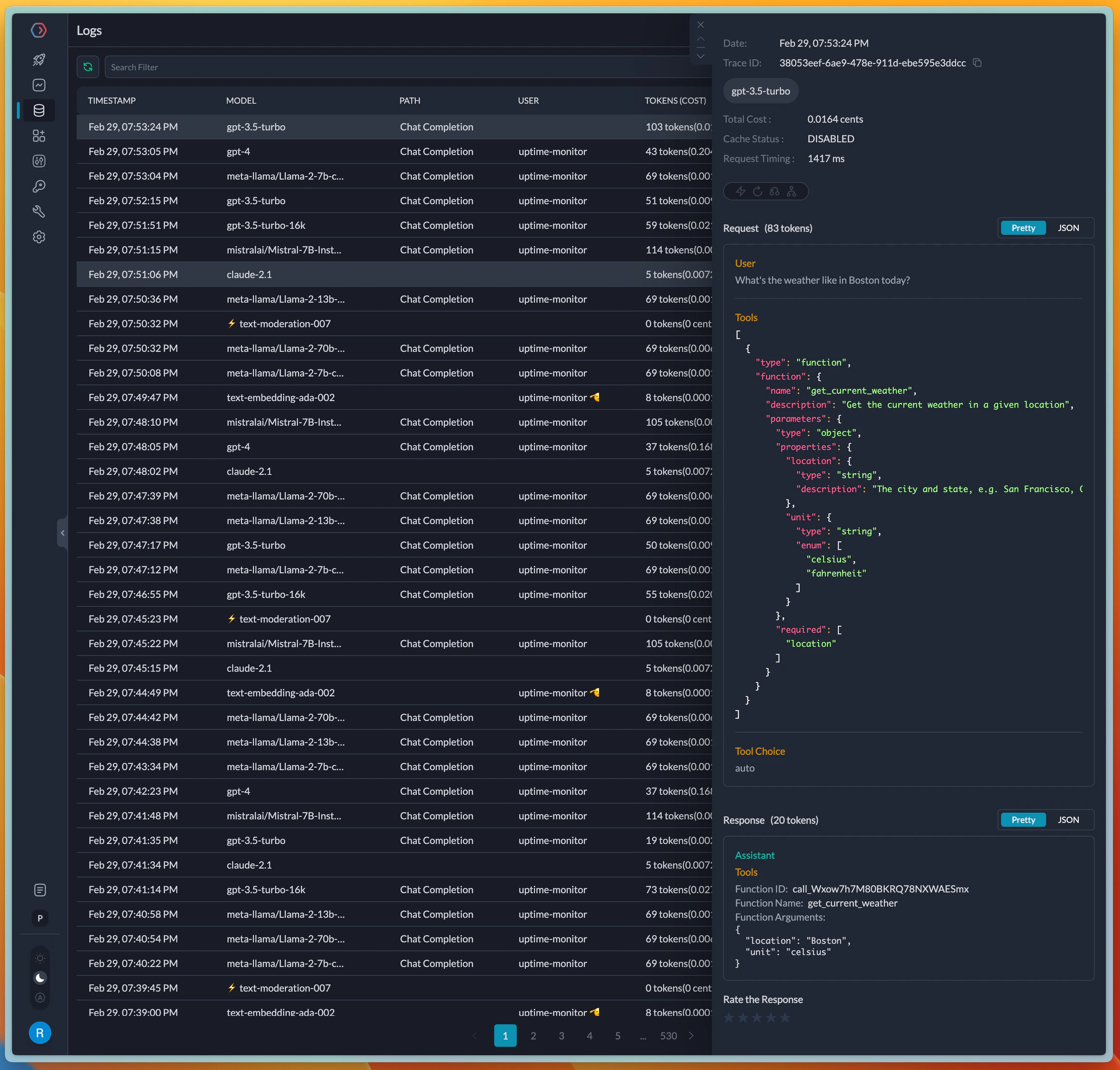 On completion, the request logs in the Portkey UI where tools and functions are visible. Portkey automatically formats the JSON blocks in the input and output for easier debugging.